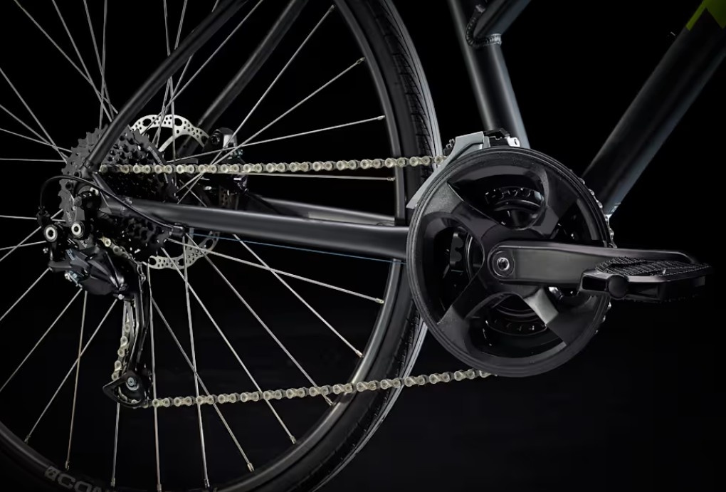 | Drivetrain | Shimano Altus shifters (9‑speed), Shimano Acera front derailleur, Shimano Altus M2000 rear derailleur; forged alloy crank 46/30T with chainguard; Shimano HG200 cassette (11‑36, 9‑speed) and KMC X9 chain |